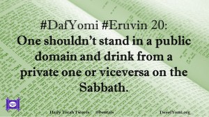 DafYomi, Eruvin #DafYomi #Eruvin 20 Date: August 28, 2020Author: ysspitz #DafYomi #Eruvin 20: One shouldn’t stand in a public domain and drink from a private one or viceversa on the Sabbath. Share this: Share on X (Opens in new window) X Share on Facebook (Opens in new window) Facebook Like Loading... Related