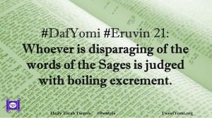 DafYomi, Eruvin #DafYomi #Eruvin 21 Date: August 31, 2020Author: ysspitz #DafYomi #Eruvin 21: Whoever is disparaging of the words of the Sages is judged with boiling excrement. Share this: Share on X (Opens in new window) X Share on Facebook (Opens in new window) Facebook Like Loading... Related