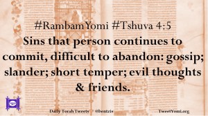 #RambamYomi #Tshuva 4:5 Sins that person continues to commit, difficult to abandon: gossip; slander; short temper; evil thoughts & friends.