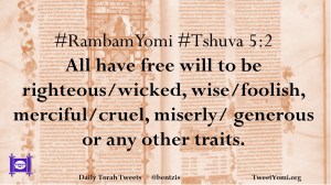 #RambamYomi #Tshuva 5:2 All have free will to be righteous/wicked, wise/foolish, merciful/cruel, miserly/ generous or any other traits.