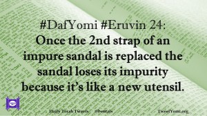 DafYomi, Eruvin #DafYomi #Eruvin 24 Date: September 3, 2020Author: ysspitz #DafYomi #Eruvin 24: Once the 2nd strap of an impure sandal is replaced the sandal loses its impurity because it’s like a new utensil. Share this: Share on X (Opens in new window) X Share on Facebook (Opens in new window) Facebook Like Loading... Related