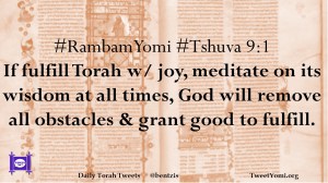 #RambamYomi #Tshuva 9:1 If fulfill Torah w/ joy, meditate on its wisdom at all times, God will remove all obstacles & grant good to fulfill.