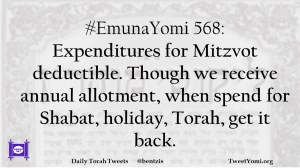 #EmunaYomi 568: Expenditures for Mitzvot deductible. Though we receive annual allotment, when spend for Shabat, holiday, Torah, get it back.