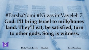 #ParshaYomi #NitzavimVayeleh 7: God: I’ll bring Israel to milk/honey land. They’ll eat, be satisfied, turn to other gods. Song is witness.