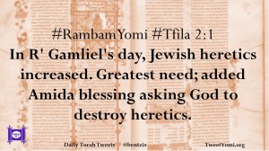 #RambamYomi #Tfila 2:1 In R’ Gamliel’s day, Jewish heretics increased. Greatest need; added Amida blessing asking God to destroy heretics.