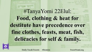 #TanyaYomi 22Elul: Food, clothing & heat for destitute have precedence over fine clothes, feasts, meat, fish, delicacies for self & family.