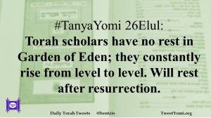 #TanyaYomi 26Elul: Torah scholars have no rest in Garden of Eden; they constantly rise from level to level. Will rest after resurrection.
