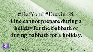 DafYomi, Eruvin #DafYomi #Eruvin 38 Date: September 17, 2020Author: ysspitz #DafYomi #Eruvin 38: One cannot prepare during a holiday for the Sabbath or during Sabbath for a holiday. Share this: Share on X (Opens in new window) X Share on Facebook (Opens in new window) Facebook Like Loading... Related
