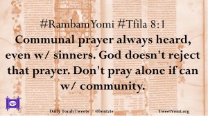 #RambamYomi #Tfila 8:1 Communal prayer always heard, even w/ sinners. God doesn’t reject that prayer. Don’t pray alone if can w/ community.