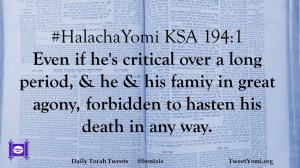 #HalachaYomi KSA 194:1 Even if he’s critical over a long period, & he & his famiy in great agony, forbidden to hasten his death in any way.