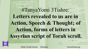 #TanyaYomi 3Tishre: Letters revealed to us are in Action, Speech & Thought; of Action, forms of letters in Assyrian script of Torah scroll.