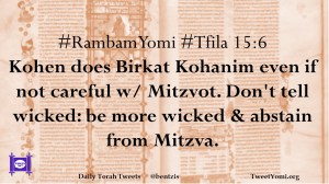 #RambamYomi #Tfila 15:6 Kohen does Birkat Kohanim even if not careful w/ Mitzvot. Don’t tell wicked: be more wicked & abstain from Mitzva.