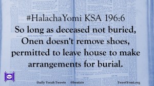 #HalachaYomi KSA 196:6 So long as deceased not buried, Onen doesn’t remove shoes, permitted to leave house to make arrangements for burial.