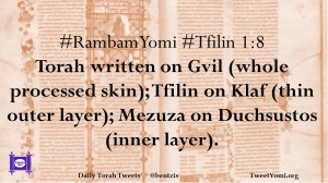 #RambamYomi #Tfilin 1:8 Torah written on Gvil (whole processed skin); Tfilin on Klaf (thin outer layer); Mezuza on Duchsustos (inner layer).