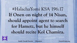#HalachaYomi KSA 196:17 If Onen on night of 14 Nisan, should appoint agent to search for Hametz, but he himself should recite Kol Chamira.