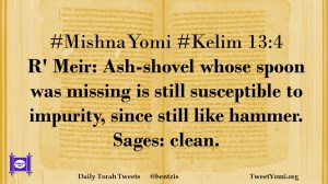 #MishnaYomi #Kelim 13:4 R’ Meir: Ash-shovel whose spoon was missing is still susceptible to impurity, since still like hammer. Sages: clean.