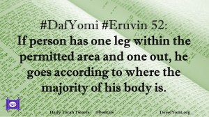 DafYomi, Eruvin #DafYomi #Eruvin 52 Date: October 1, 2020Author: ysspitz #DafYomi #Eruvin 52: If person has one leg within the permitted area and one out, he goes according to where the majority of his body is. Share this: Share on X (Opens in new window) X Share on Facebook (Opens in new window) Facebook Like Loading... Related