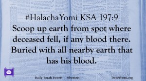 #HalachaYomi KSA 197:9 Scoop up earth from spot where deceased fell, if any blood there. Buried with all nearby earth that has his blood.