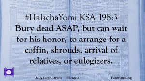 #HalachaYomi KSA 198:3 Bury dead ASAP, but can wait for his honor, to arrange for a coffin, shrouds, arrival of relatives, or eulogizers.