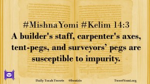 Kelim, MishnaYomi #MishnaYomi #Kelim 14:3 Date: October 1, 2020Author: ysspitz #MishnaYomi #Kelim 14:3 A builder’s staff, carpenter’s axes, tent-pegs, and surveyors’ pegs are susceptible to impurity. Share this: Share on X (Opens in new window) X Share on Facebook (Opens in new window) Facebook Like Loading... Related