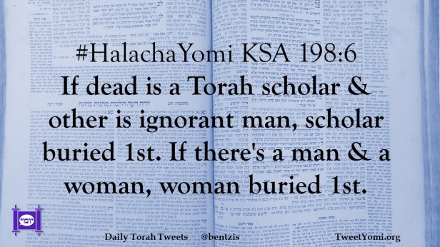 #HalachaYomi KSA 198:6 If dead is a Torah scholar & other is ignorant man, scholar buried 1st. If there’s a man & a woman, woman buried 1st.