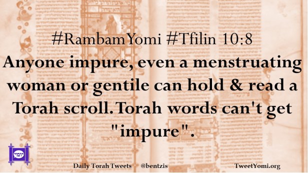 #RambamYomi #Tfilin 10:8 Anyone impure, even a menstruating woman or gentile can hold & read a Torah scroll. Torah words can’t get “impure”.