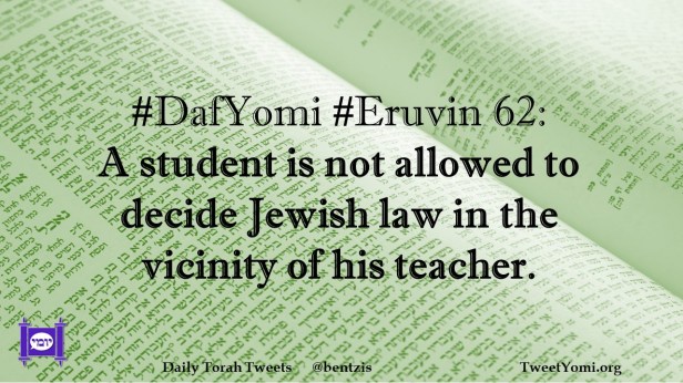 DafYomi, Eruvin #DafYomi #Eruvin 62 Date: October 9, 2020Author: ysspitz #DafYomi #Eruvin 62: A student is not allowed to decide Jewish law in the vicinity of his teacher. Share this: Share on X (Opens in new window) X Share on Facebook (Opens in new window) Facebook Like Loading... Related