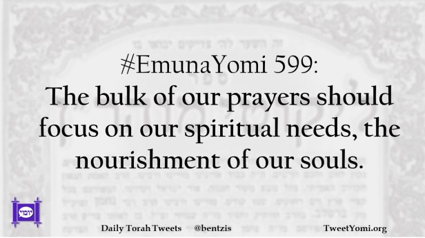 EmunaYomi #EmunaYomi 599 Date: October 9, 2020Author: ysspitz #EmunaYomi 599: The bulk of our prayers should focus on our spiritual needs, the nourishment of our souls. Share this: Share on X (Opens in new window) X Share on Facebook (Opens in new window) Facebook Like Loading... Related