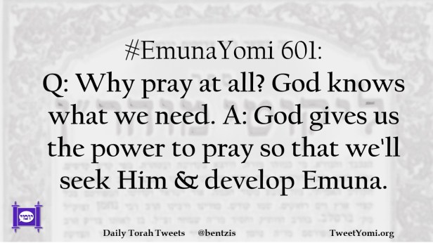 #EmunaYomi 601: Q: Why pray at all? God knows what we need. A: God gives us the power to pray so that we’ll seek Him & develop Emuna.