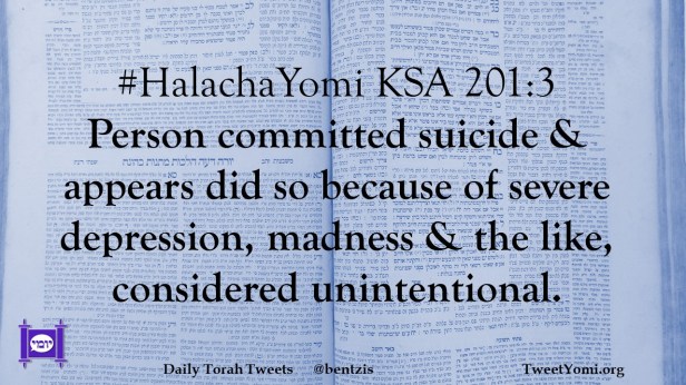 #HalachaYomi KSA 201:3 Person committed suicide & appears did so because of severe depression, madness & the like, considered unintentional.
