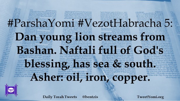 #ParshaYomi #VezotHabracha 5: Dan young lion streams from Bashan. Naftali full of God’s blessing, has sea & south. Asher: oil, iron, copper.