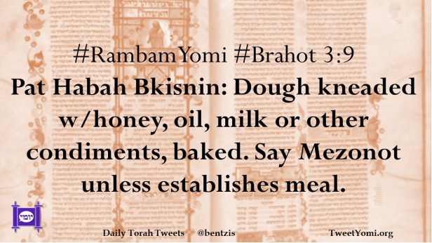 #RambamYomi #Brahot 3:9 Pat Habah Bkisnin: Dough kneaded w/honey, oil, milk or other condiments, baked. Say Mezonot unless establishes meal.