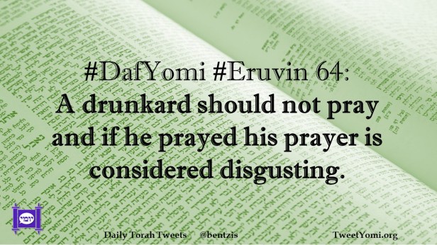 DafYomi, Eruvin #DafYomi #Eruvin 64 Date: October 14, 2020Author: ysspitz #DafYomi #Eruvin 64: A drunkard should not pray and if he prayed his prayer is considered disgusting. Share this: Share on X (Opens in new window) X Share on Facebook (Opens in new window) Facebook Like Loading... Related