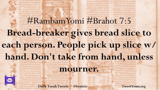 #RambamYomi #Brahot 7:5 Bread-breaker gives bread slice to each person. People pick up slice w/ hand. Don’t take from hand, unless mourner.