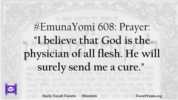 EmunaYomi #EmunaYomi 608 Date: October 18, 2020Author: ysspitz #EmunaYomi 608: Prayer: “I believe that God is the physician of all flesh. He will surely send me a cure.” Share this: Share on X (Opens in new window) X Share on Facebook (Opens in new window) Facebook Like Loading... Related