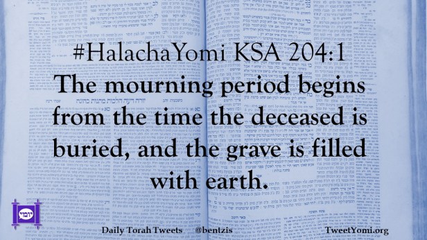 HalachaYomi #HalachaYomi KSA 204:1 Date: October 18, 2020Author: ysspitz #HalachaYomi KSA 204:1 The mourning period begins from the time the deceased is buried, and the grave is filled with earth. Share this: Share on X (Opens in new window) X Share on Facebook (Opens in new window) Facebook Like Loading... Related