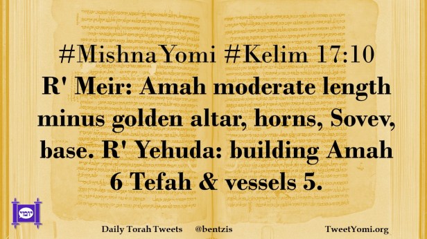 #MishnaYomi #Kelim 17:10 R’ Meir: Amah moderate length minus golden altar, horns, Sovev, base. R’ Yehuda: building Amah 6 Tefah & vessels 5.