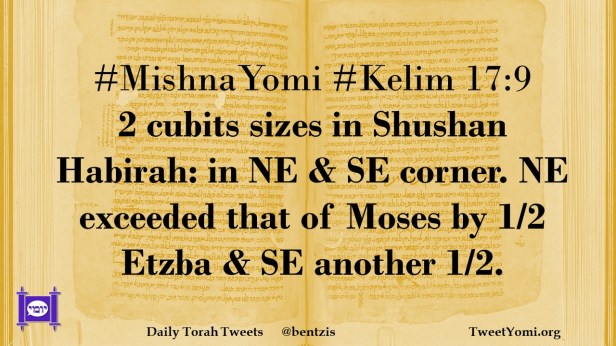 #MishnaYomi #Kelim 17:9 2 cubits sizes in Shushan Habirah: in NE & SE corner. NE exceeded that of Moses by 1/2 Etzba & SE another 1/2.