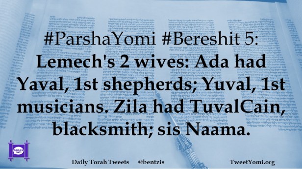 #ParshaYomi #Bereshit 5: Lemech’s 2 wives: Ada had Yaval, 1st shepherds; Yuval, 1st musicians. Zila had TuvalCain, blacksmith; sis Naama.
