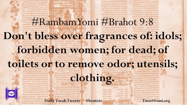 #RambamYomi #Brahot 9:8 Don’t bless over fragrances of: idols; forbidden women; for dead; of toilets or to remove odor; utensils; clothing.