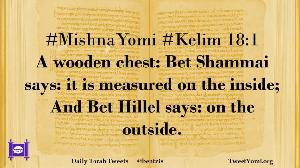 Kelim, MishnaYomi #MishnaYomi #Kelim 18:1 Date: October 21, 2020Author: ysspitz #MishnaYomi #Kelim 18:1 A wooden chest: Bet Shammai says: it is measured on the inside; And Bet Hillel says: on the outside. Share this: Share on X (Opens in new window) X Share on Facebook (Opens in new window) Facebook Like Loading... Related