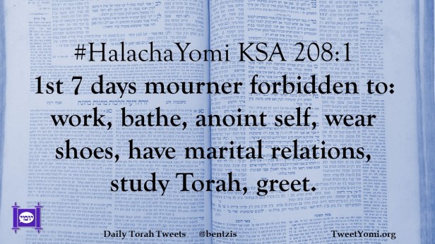 #HalachaYomi KSA 208:1 1st 7 days mourner forbidden to: work, bathe, anoint self, wear shoes, have marital relations, study Torah, greet.