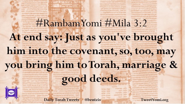 #RambamYomi #Mila 3:2 At end say: Just as you’ve brought him into the covenant, so, too, may you bring him to Torah, marriage & good deeds.