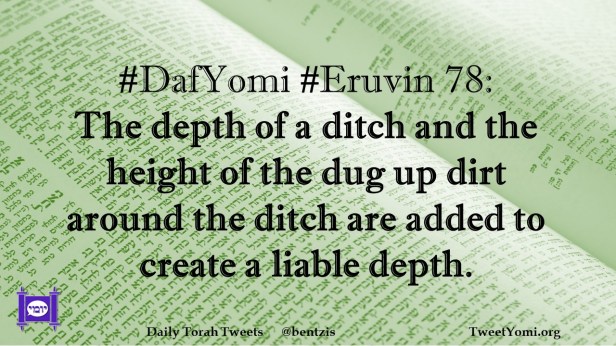 DafYomi, Eruvin #DafYomi #Eruvin 78 Date: October 26, 2020Author: ysspitz #DafYomi #Eruvin 78: The depth of a ditch and the height of the dug up dirt around the ditch are added to create a liable depth. Share this: Share on X (Opens in new window) X Share on Facebook (Opens in new window) Facebook Like Loading... Related