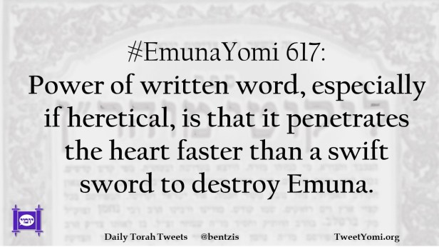 #EmunaYomi 617: Power of written word, especially if heretical, is that it penetrates the heart faster than a swift sword to destroy Emuna.