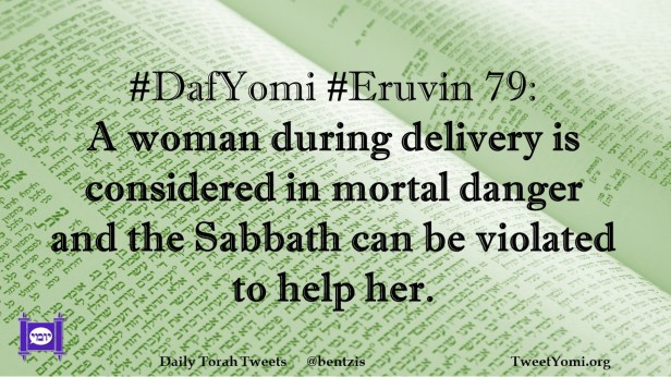 DafYomi, Eruvin #DafYomi #Eruvin 79 Date: October 27, 2020Author: ysspitz #DafYomi #Eruvin 79: A woman during delivery is considered in mortal danger and the Sabbath can be violated to help her. Share this: Share on X (Opens in new window) X Share on Facebook (Opens in new window) Facebook Like Loading... Related