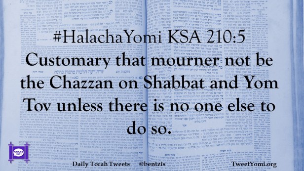 #HalachaYomi KSA 210:5 Customary that mourner not be the Chazzan on Shabbat and Yom Tov unless there is no one else to do so.