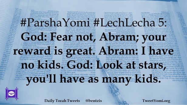 #ParshaYomi #LechLecha 5: God: Fear not, Abram; your reward is great. Abram: I have no kids. God: Look at stars, you’ll have as many kids.