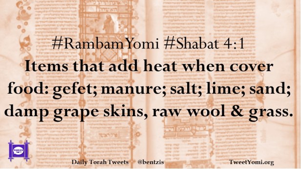 #RambamYomi #Shabat 4:1 Items that add heat when cover food: gefet; manure; salt; lime; sand; damp grape skins, raw wool & grass.