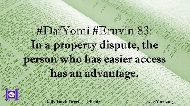 DafYomi, Eruvin #DafYomi #Eruvin 83 Date: November 1, 2020Author: ysspitz #DafYomi #Eruvin 83: In a property dispute, the person who has easier access has an advantage. Share this: Share on X (Opens in new window) X Share on Facebook (Opens in new window) Facebook Like Loading... Related